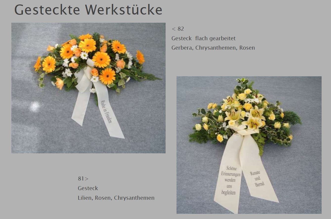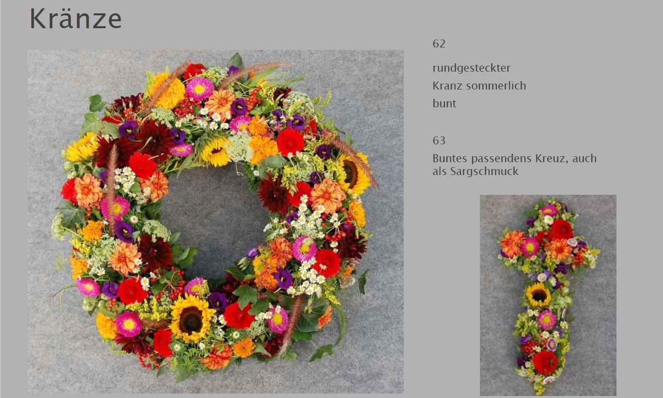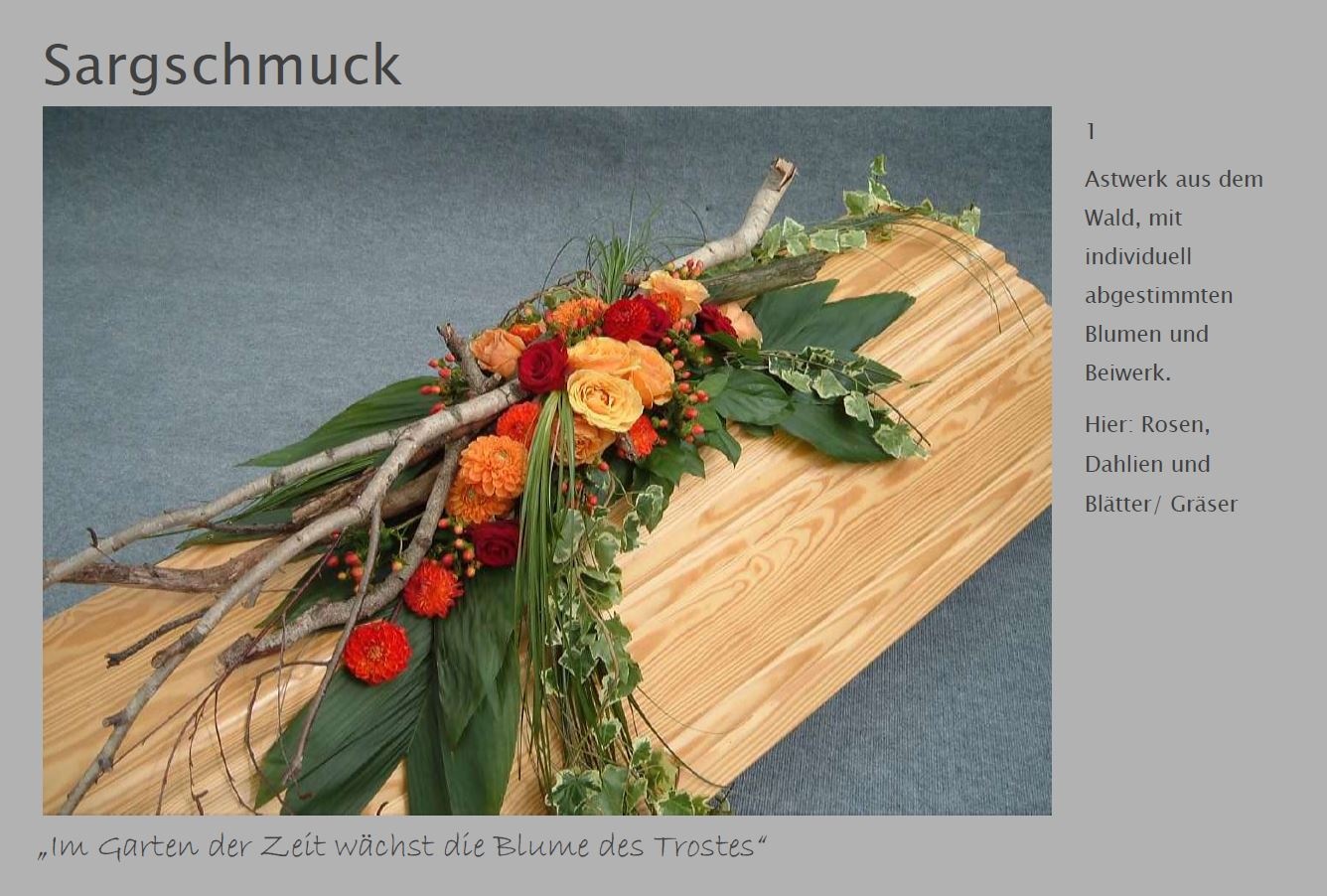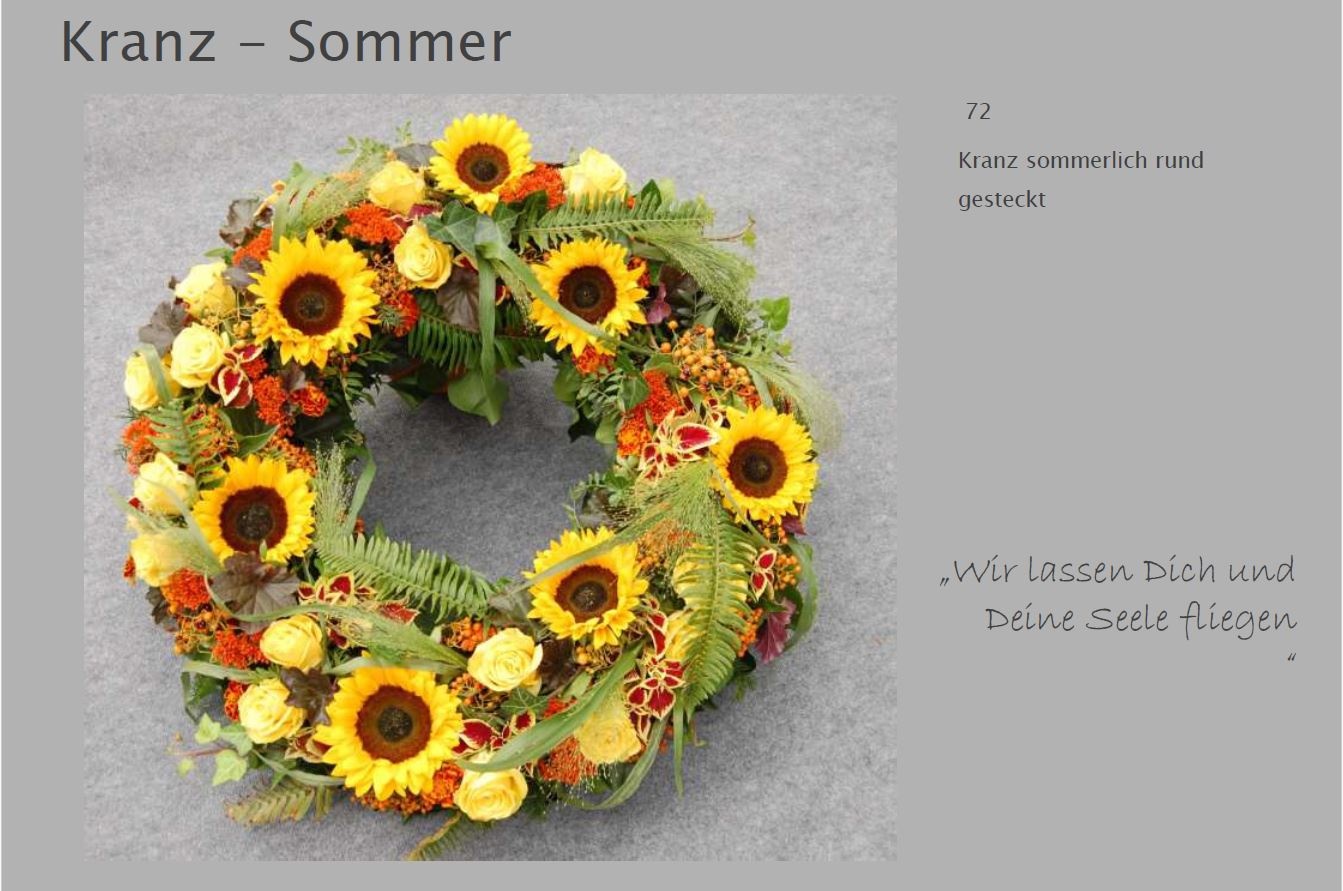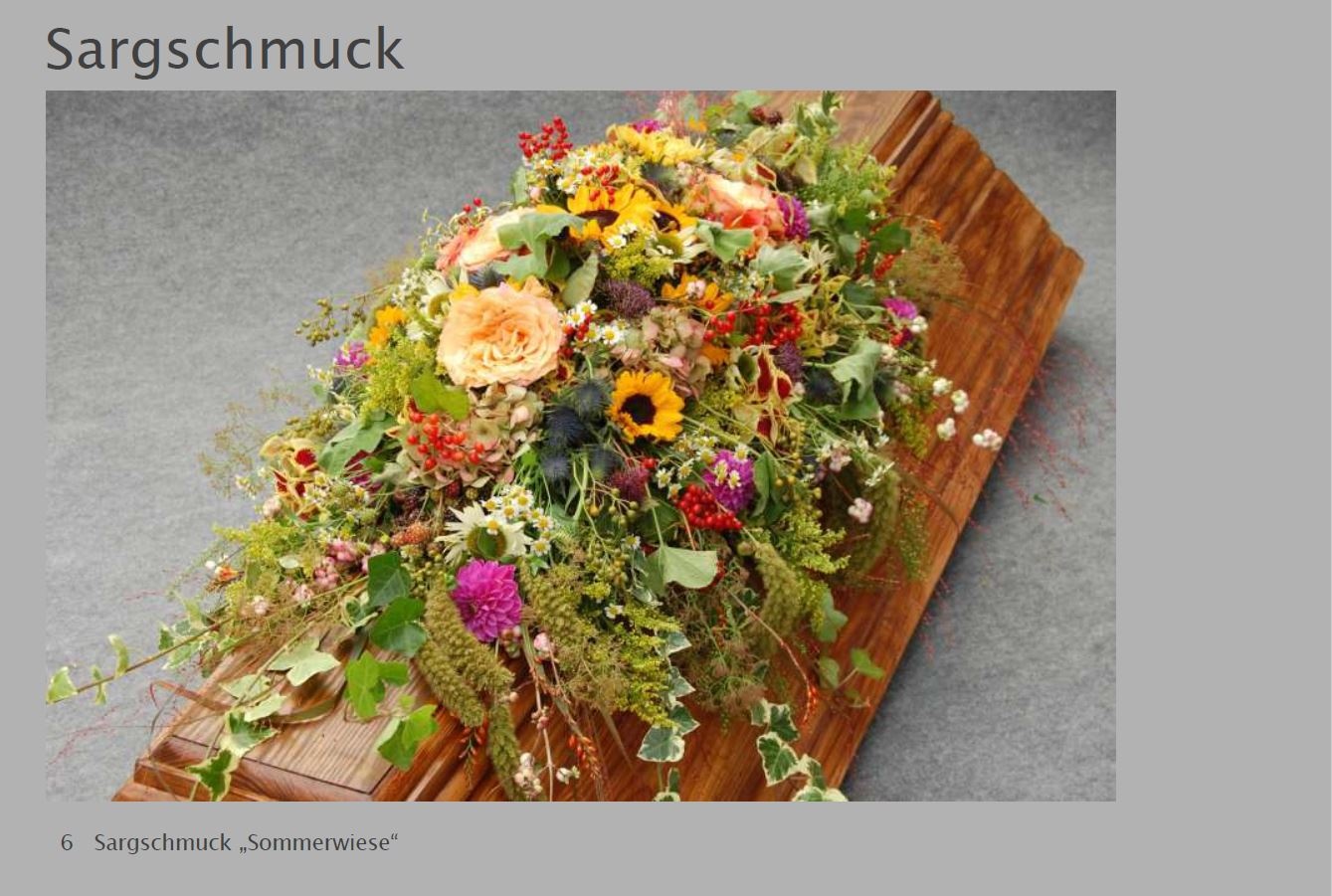 Blumen vermitteln beim Abschied eine besondere Botschaft. Jede Blüte trägt eine Bedeutung: Schönheit, Dank, Erinnerung. Ob als Kranz, Gesteck, großer Sonnenblumenstrauß oder einzelne Rose: Die Trauerfloristik macht jeden Raum warm und würdevoll. Wir helfen Ihnen gern bei der Auswahl. Hier sehen Sie einige Beispiele für Sargschmuck. Auch passende Schleifentexte haben wir für Sie zusammengestellt.