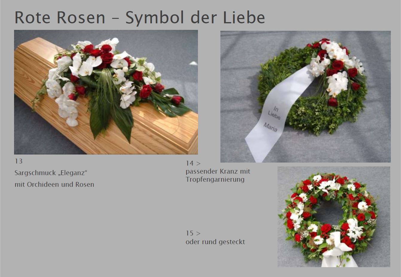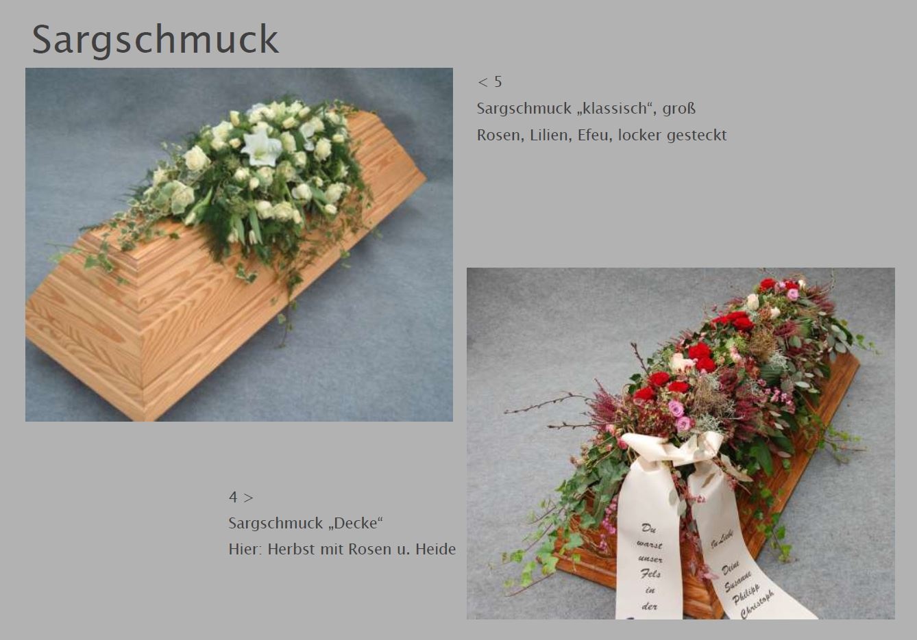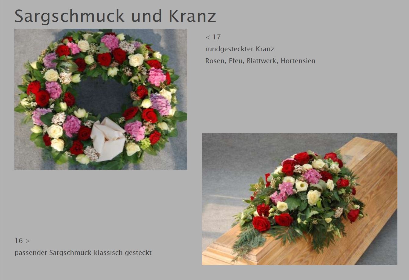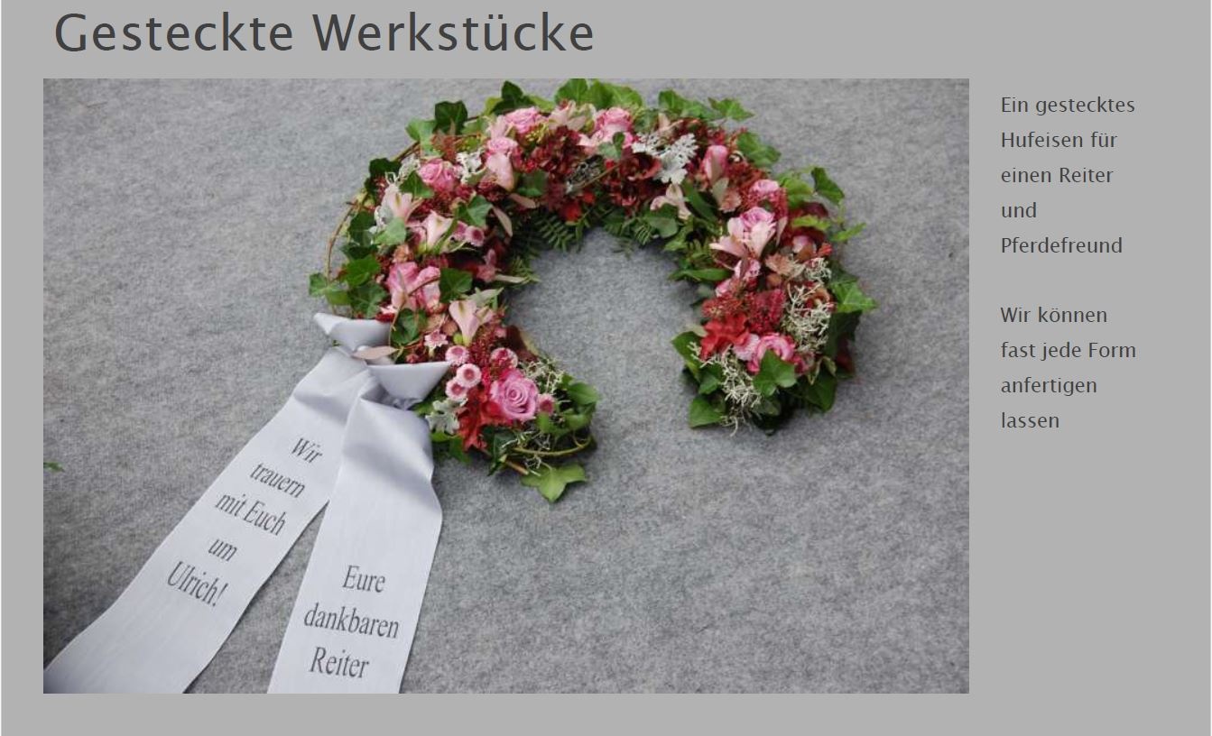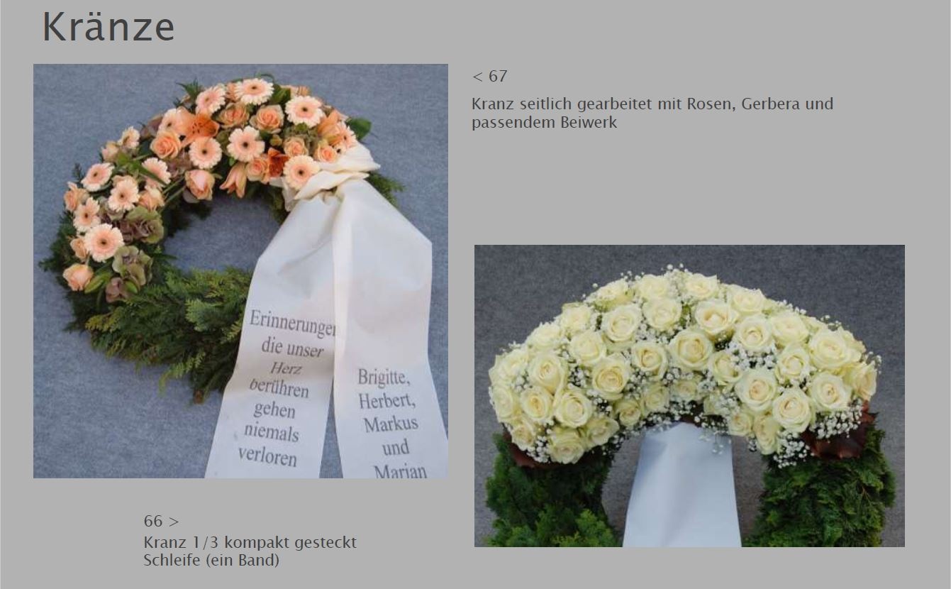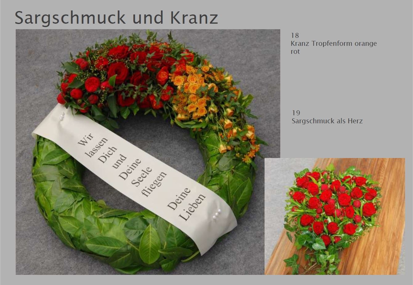 Blumen vermitteln beim Abschied eine besondere Botschaft. Jede Blüte trägt eine Bedeutung: Schönheit, Dank, Erinnerung. Ob als Kranz, Gesteck, großer Sonnenblumenstrauß oder einzelne Rose: Die Trauerfloristik macht jeden Raum warm und würdevoll. Wir helfen Ihnen gern bei der Auswahl. Hier sehen Sie einige Beispiele für Sargschmuck. Auch passende Schleifentexte haben wir für Sie zusammengestellt.
