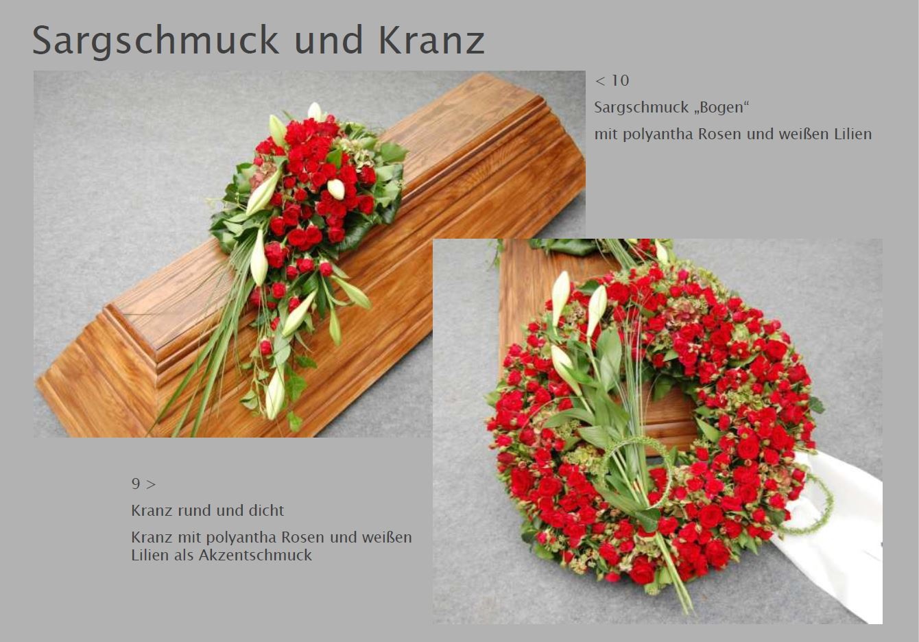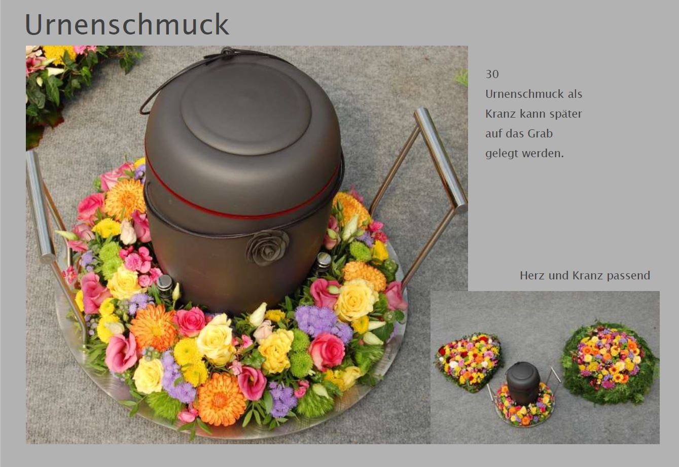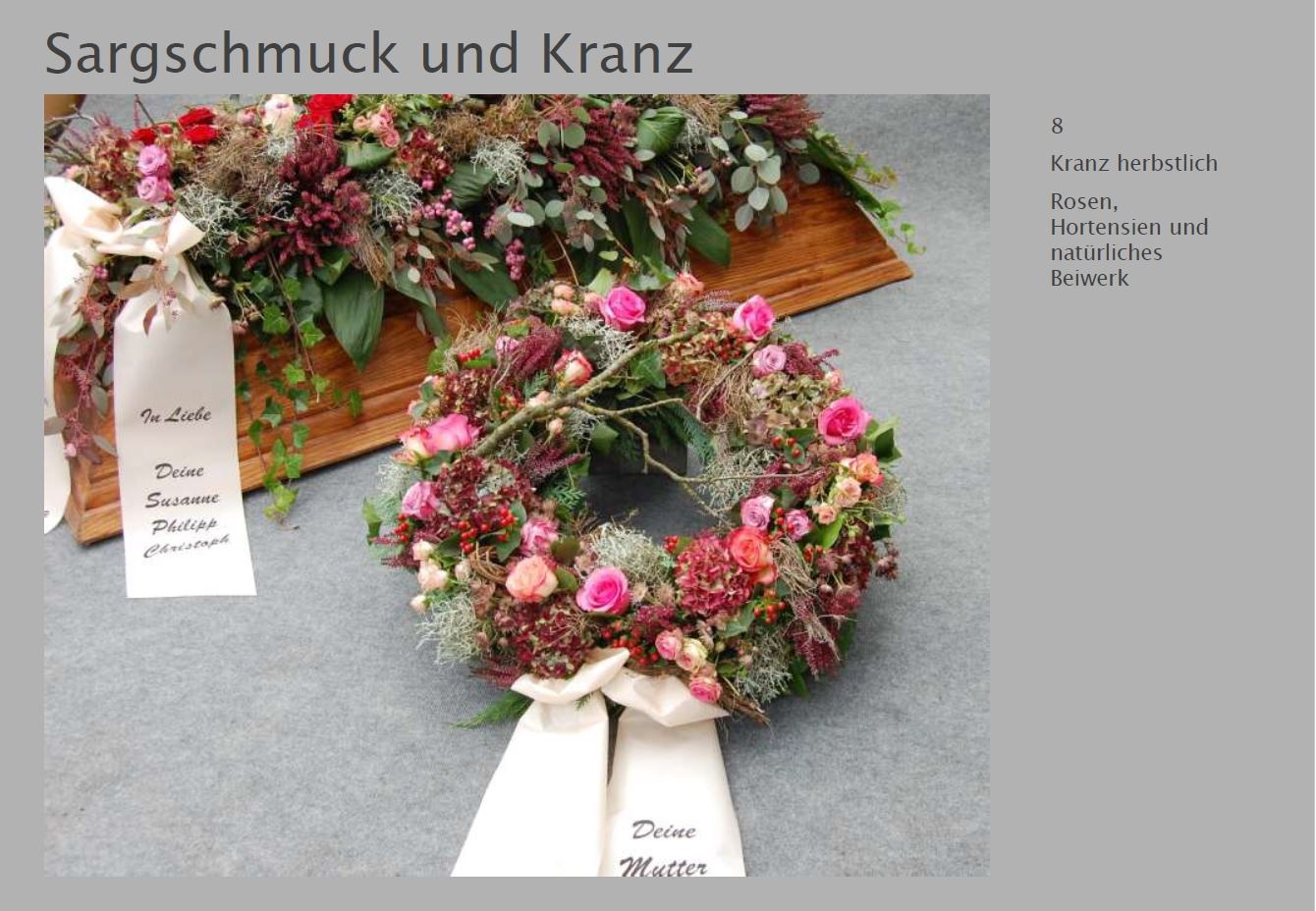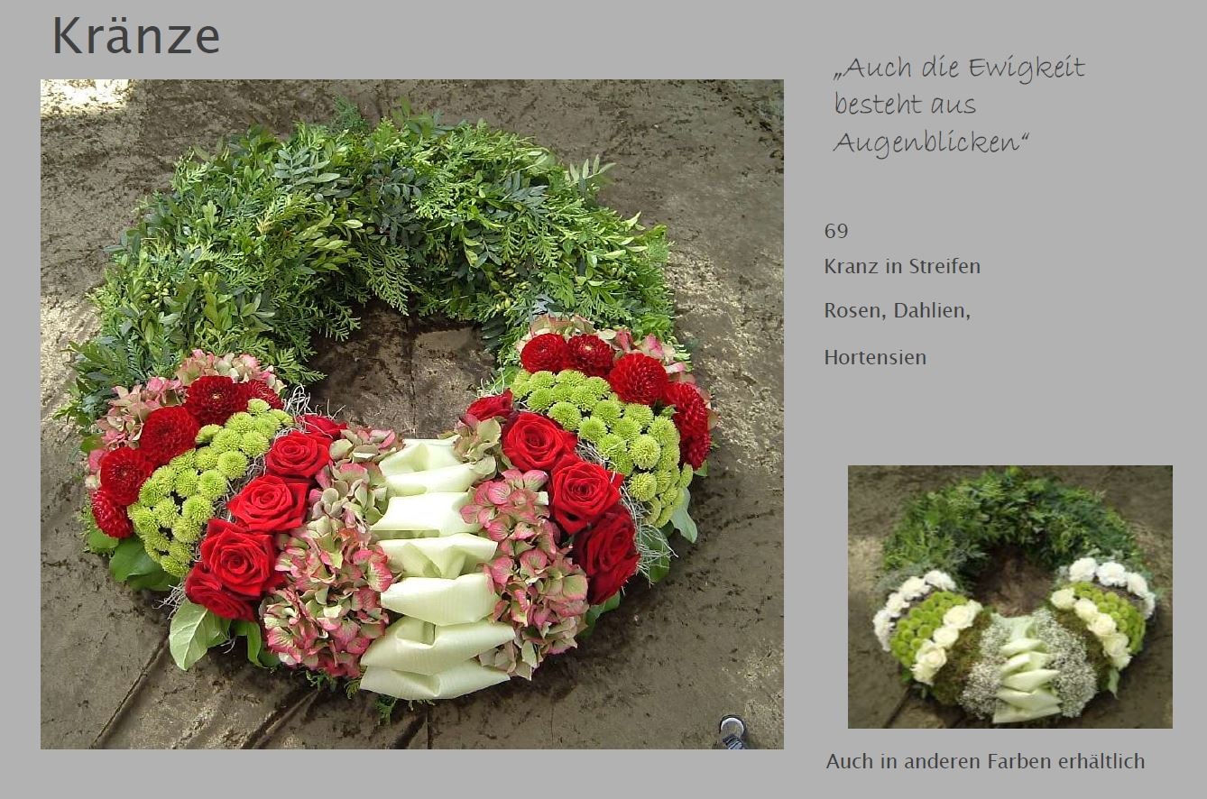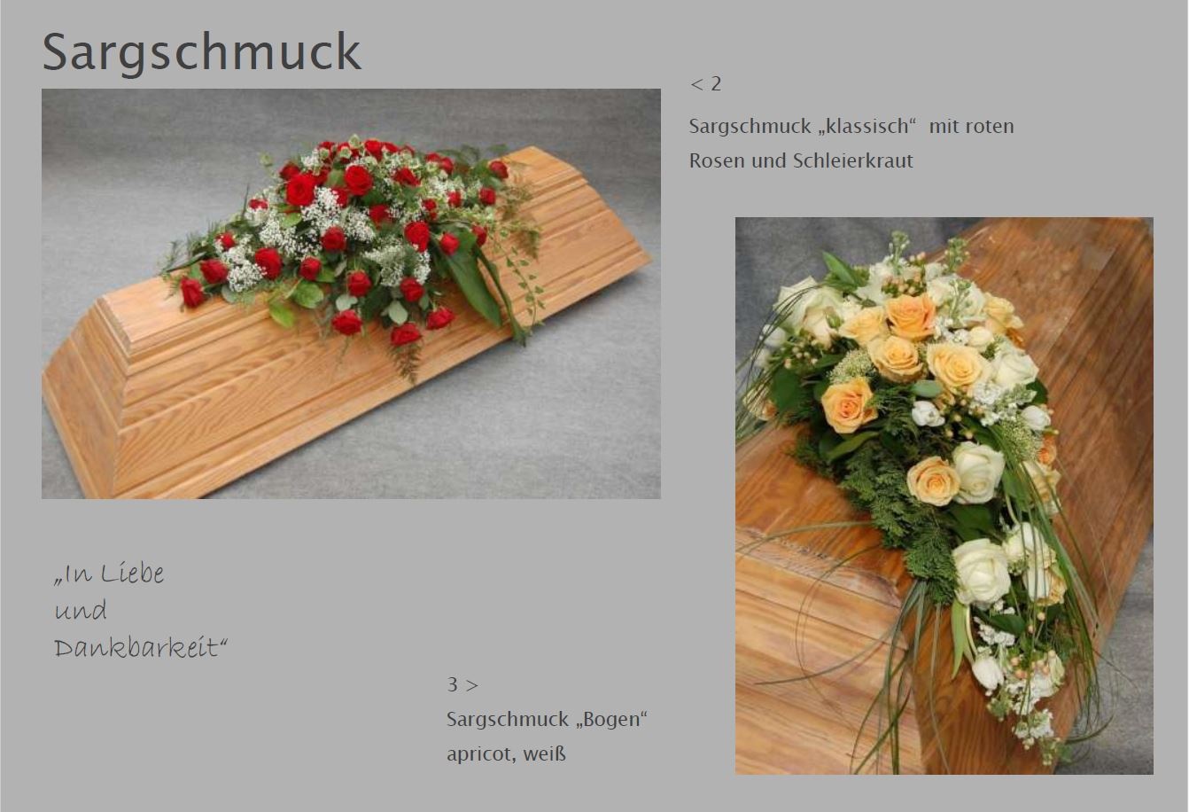Blumen vermitteln beim Abschied eine besondere Botschaft. Jede Blüte trägt eine Bedeutung: Schönheit, Dank, Erinnerung. Ob als Kranz, Gesteck, großer Sonnenblumenstrauß oder einzelne Rose: Die Trauerfloristik macht jeden Raum warm und würdevoll. Wir helfen Ihnen gern bei der Auswahl. Hier sehen Sie einige Beispiele für Sargschmuck. Auch passende Schleifentexte haben wir für Sie zusammengestellt.